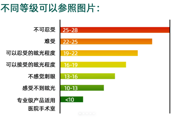 光线分布不均、设计不合理都会导致眩光,而眩光不仅会影响着视觉清晰度,还会造成视觉疲劳,影响着视力健康,而优质的护眼大路灯往往会采用专业技术减少眩光,并且防眩光化为指数等级,具体可看下图: