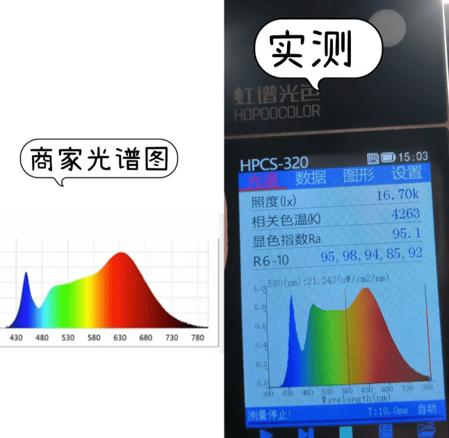 从实测全光谱中来看,柏曼整体的光谱分布还是不错的,这款护眼大路灯采用紫光全光谱激发技术,实际蓝光峰值在0.6以下,不过比较遗憾的是红光缺失,不过整体的光谱连续性比较好,实际呈现出来的光线还是蛮舒适的。