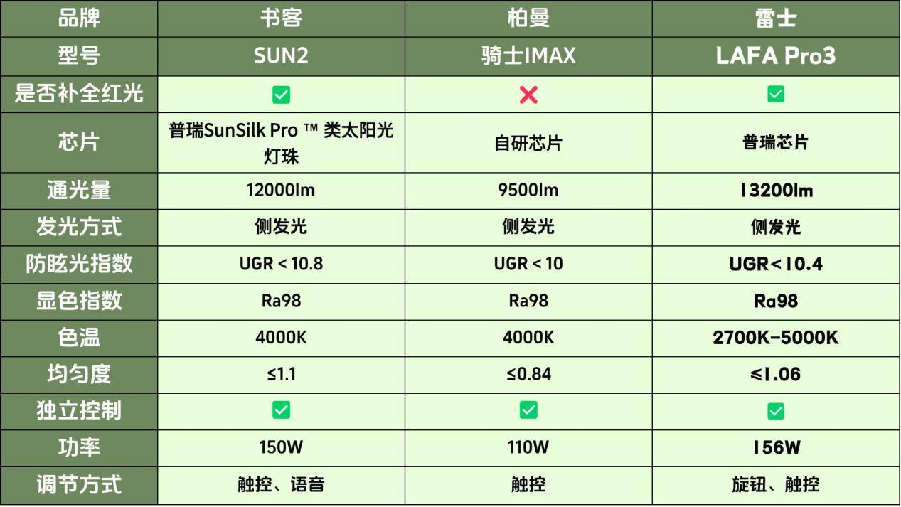 在了解完护眼大路灯选购比较重要的四点之后,在进行实测推荐之前,我还给大家总结了三款护眼大路灯的核心参数: