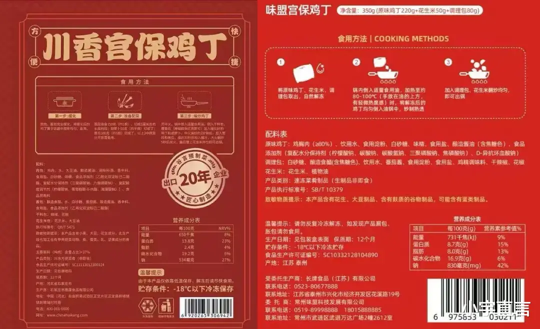 由于正在备孕,李女士对配料表看得较为仔细,她发现,同样属于非即食冷冻制品的宫保鸡丁预制菜产品,“味知香”标注的执行标准是国标GB19295,而另一个品牌“谷言”执行的是行业标准QB/T 5471。“紫光园”和“味盟”使用的又是行业标准SB/T 10379。电商平台上售卖的冷藏宫保鸡丁快手菜,基本上使用的都是行业标准SB/T10648。