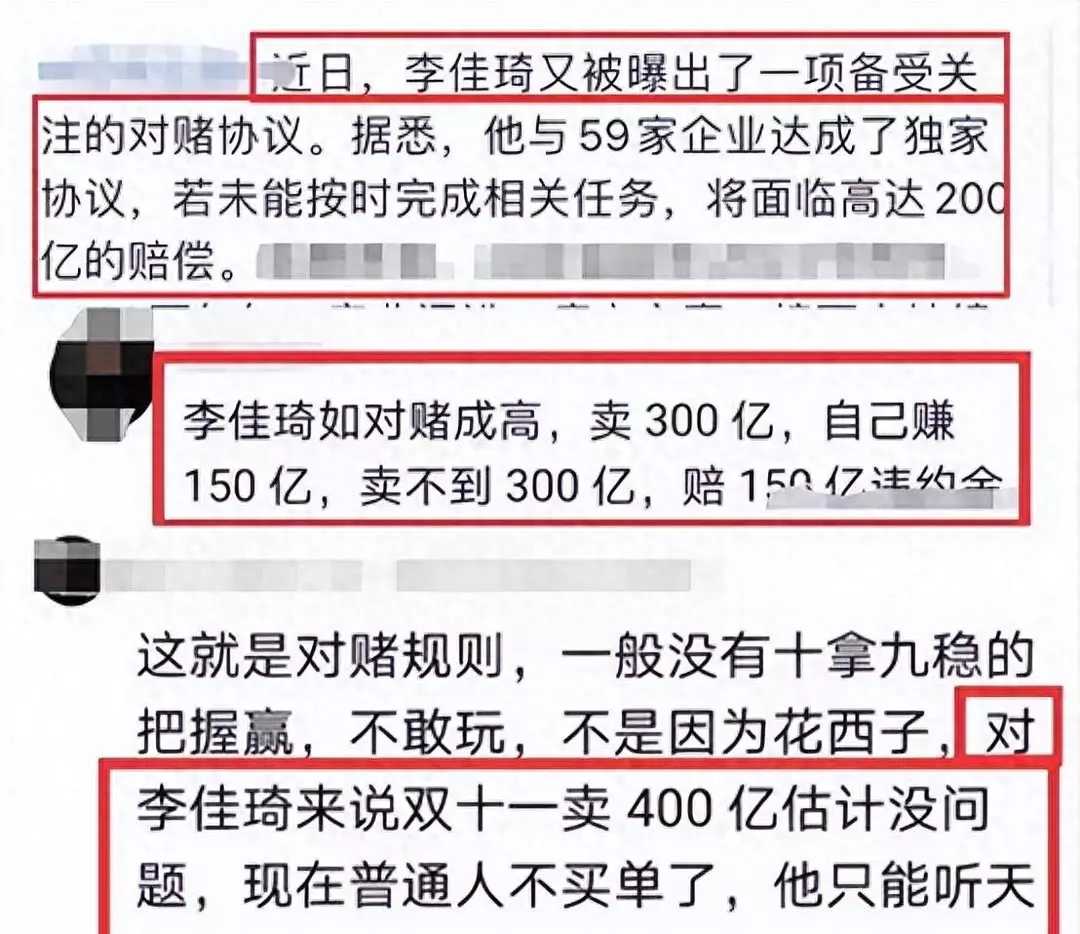 而就在眉笔事件的风波逐渐被大众所淡忘的时候,又有另外一个关于李佳琦的事件被曝光,有知情人爆料,李佳琦在今年的双十一与多家企业签订了总额高达300亿的独家销售协议,如果他在双十一的时候达到了这个销售额,毫无疑问,将会得到巨额的报酬,但同样,如果没有完成这一目标,他将面临200亿元的天价罚款。