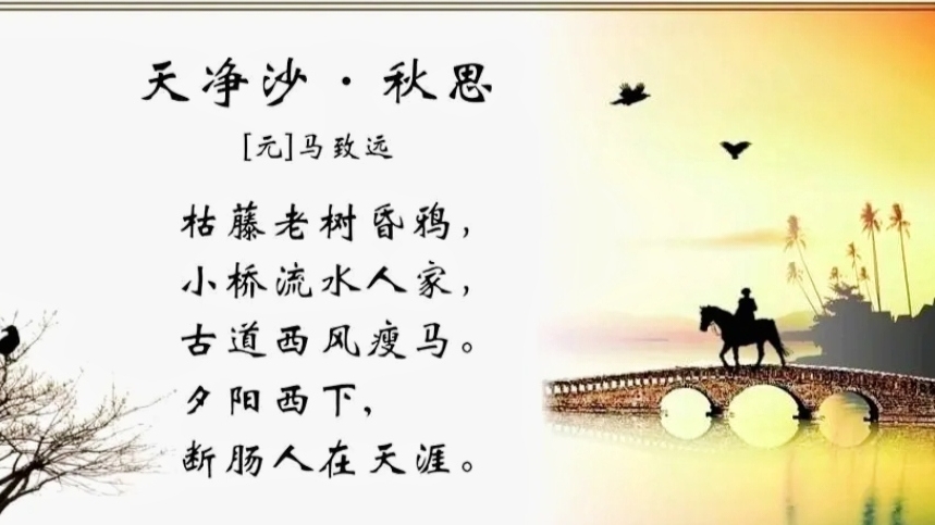 天净沙·秋思元·马致远古藤老树昏鸦,小桥流水人家,古道西风瘦马,夕阳西下,断肠人在天涯。
