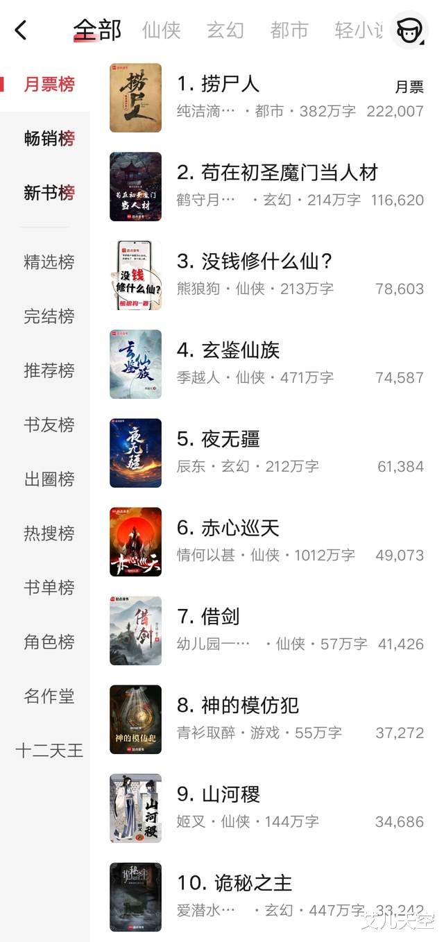 前五名的排名比较固定,没什么变动。没钱修仙十大联赛还在继续,夜无疆的更新也还努力维持在深夜前。