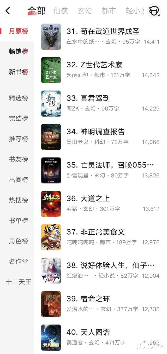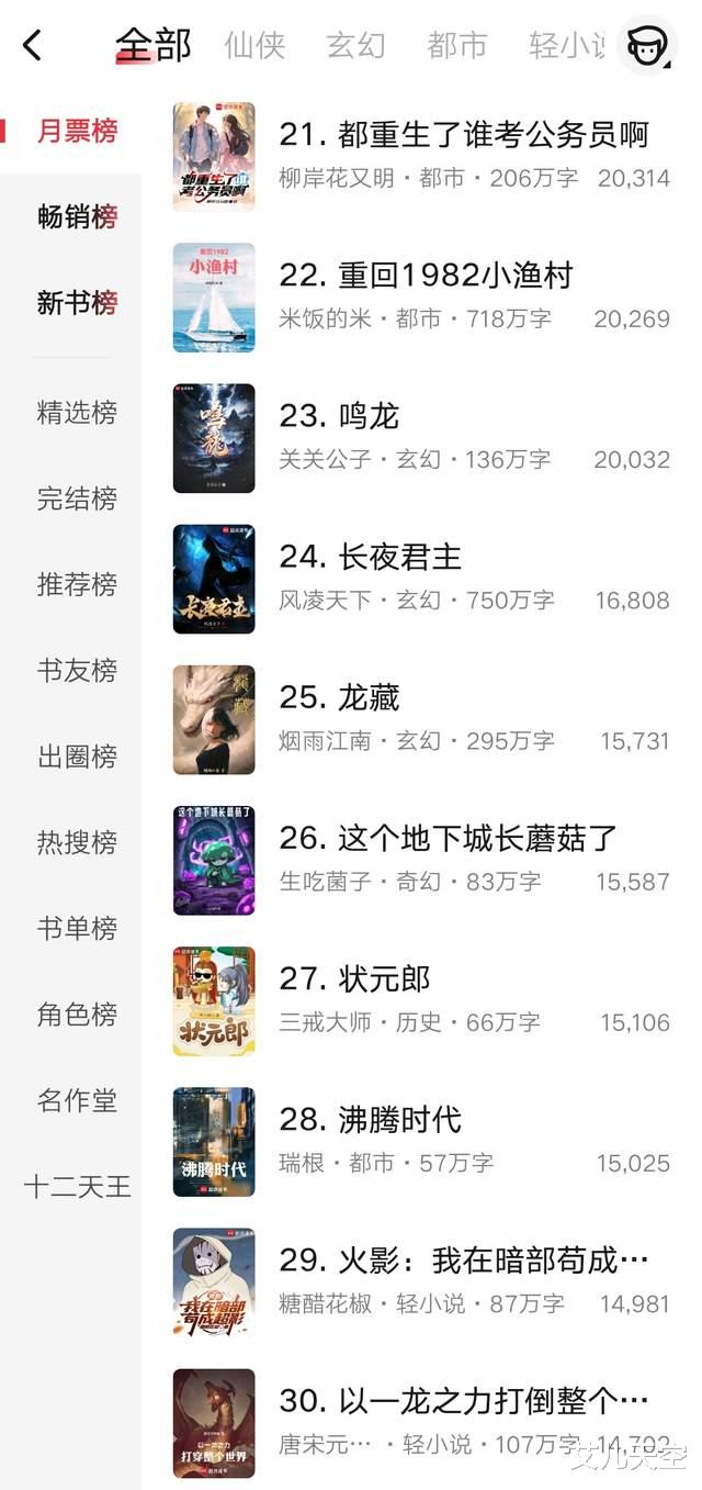 3、状元郎、沸腾时代双双进入前三十第21到30名,状元郎、沸腾时代从上周末第36、35名升了上来,上架后瑞根一直在万字更新。与之对应《神明调查报告》《亡灵法师》则被挤出前三十了。