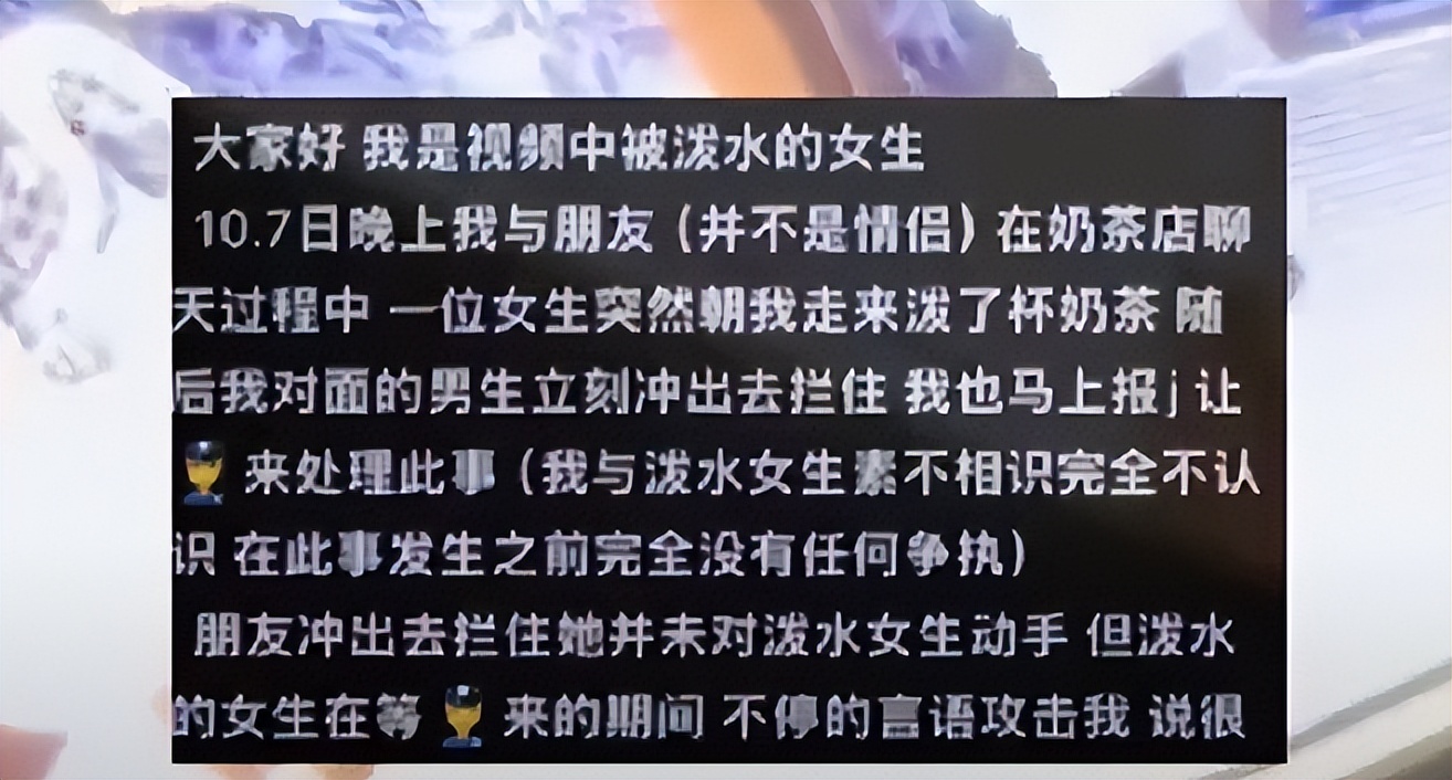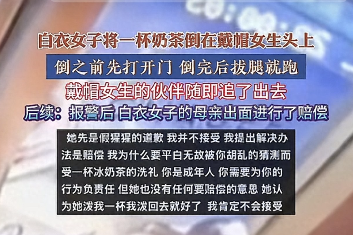 半小时后,白衣女生的母亲赶到奶茶店,进门后不停向鸭舌帽女道歉,话语中全是愧疚,称自己的女儿刚从日本留学归来一个星期,可能还没有适应国内的生活,情绪不是很稳定,希望两人能谅解。