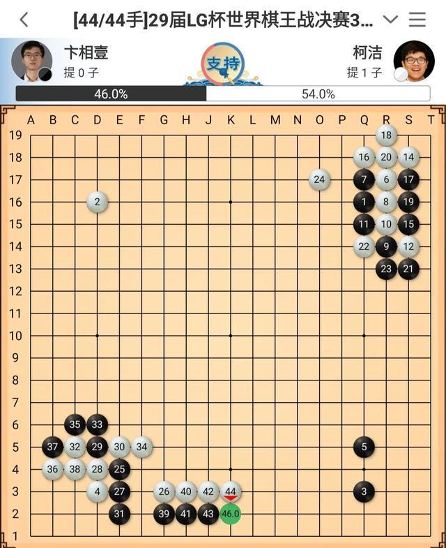 他们的第一局是1月20日进行的,柯洁执黑两目半胜,开了个好局,只要再胜一场就可获得冠军。