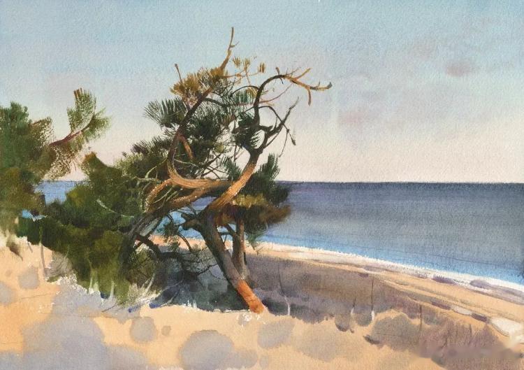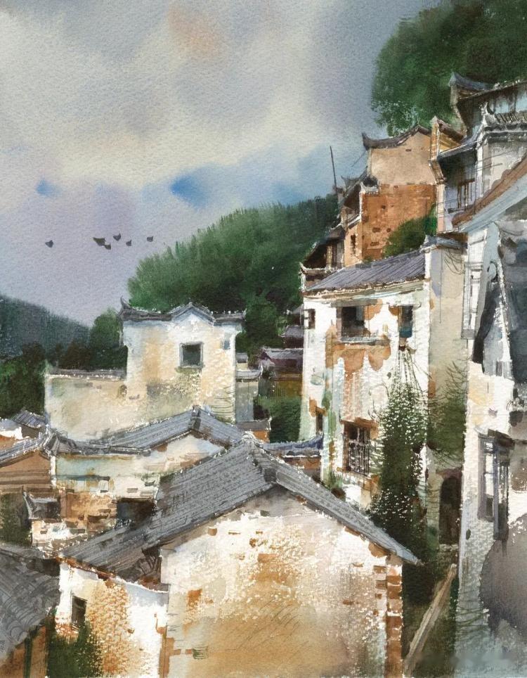 在风格上,他师承黄铁山,却融入个人艺术思考,以透明润泽的水色、严谨灵动的线性造型,搭配内敛节制的灰调,弱化色块对比,强化水墨韵味的湿染与国画功力的皴擦。