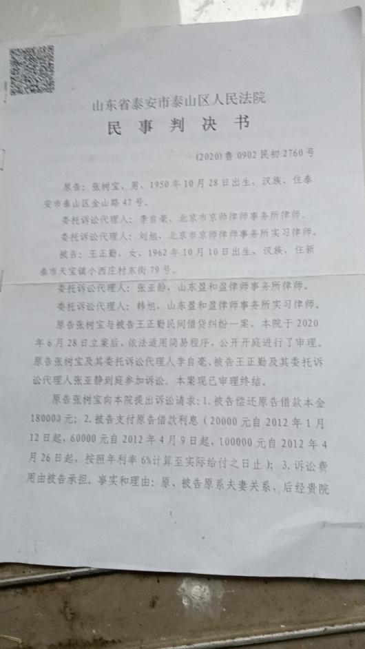 在(2020)鲁0902民初2760号民事判决书中,审判法官采纳了相关证据。经过张树宝的努力,最终法院判决王某勤赔偿18万的本金以及后续产生的利息。但王某勤的儿子王某鹏嚣张至极,在打官司前大放厥词的表示:“我在法院里有关系,有证据你也打不赢,就算赢了你也拿不到钱”。