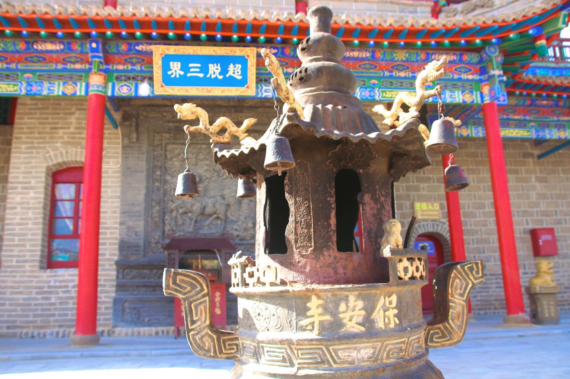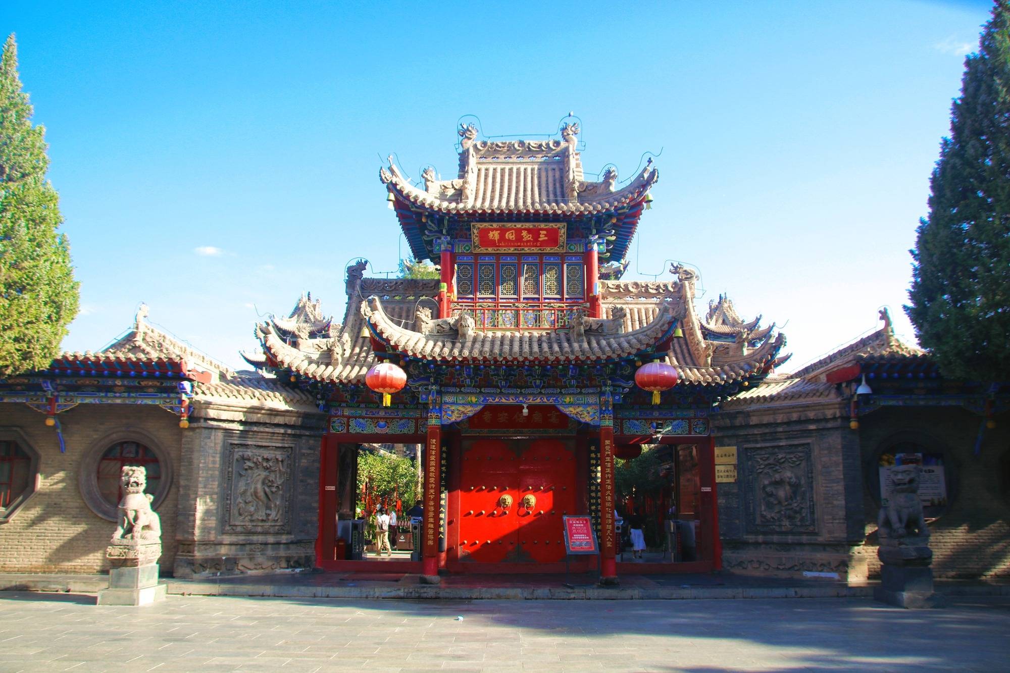 寺庙山门相当亮眼,朱红大门、飞檐斗拱、砖雕细腻生动,红底金字的匾额上写着“三圣同辉”正是这里特别的一处——佛教的佛殿、道教的三清殿、儒家的文昌阁和谐共存,这样的景象在全国都不多见。