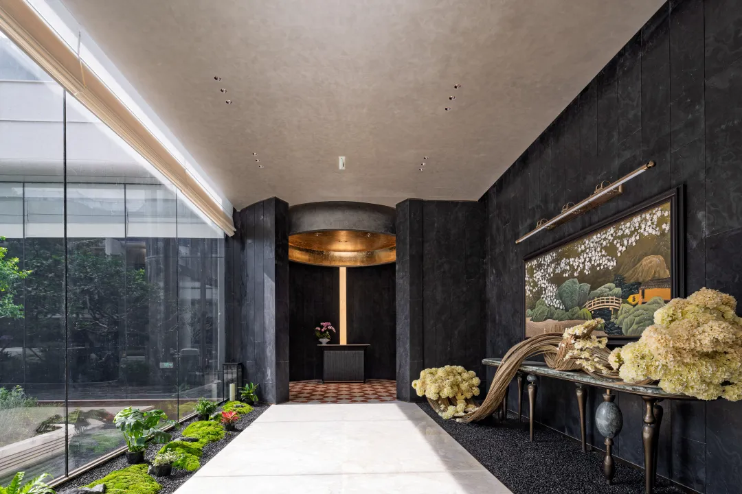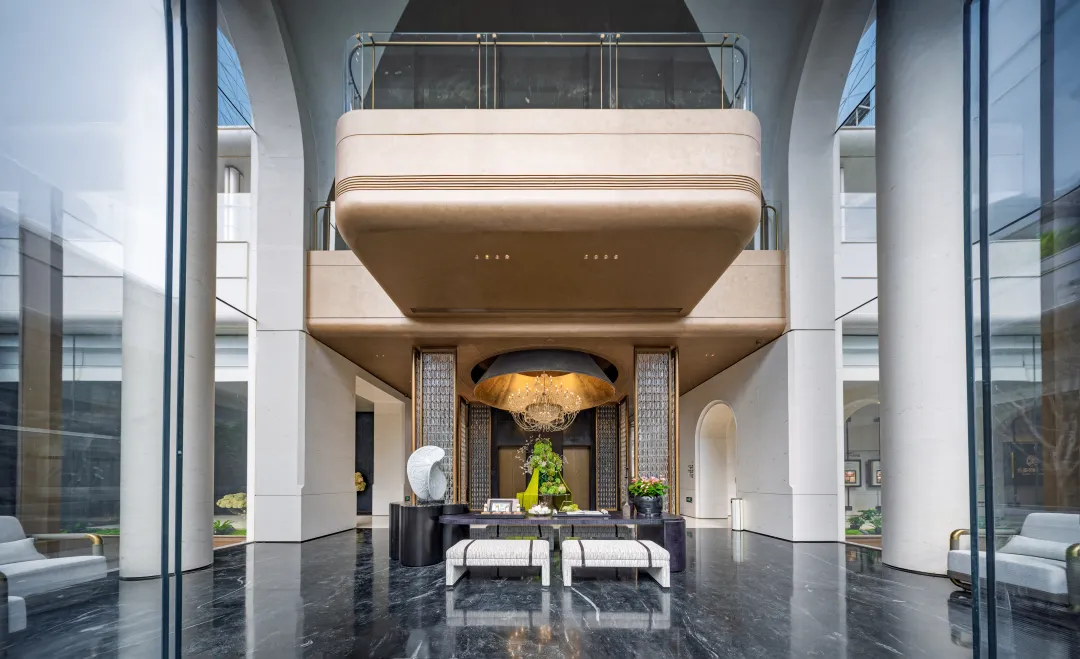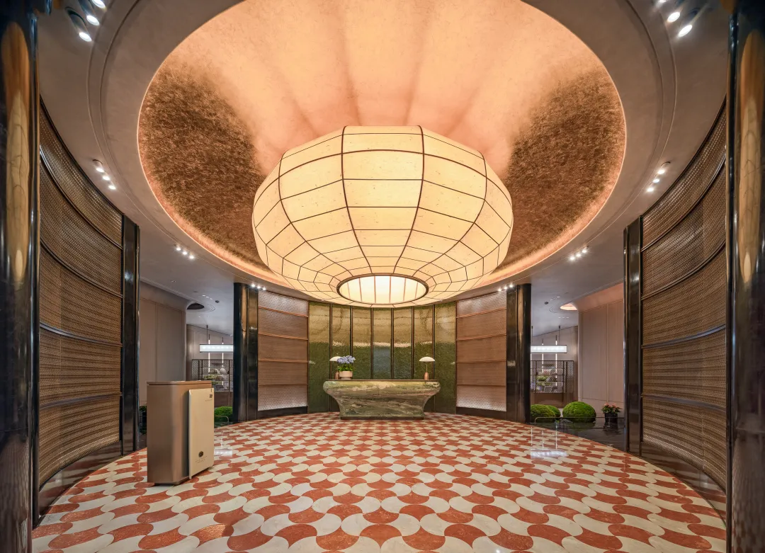 穿过“车马院”,便步入西南首个约5700㎡的亿元级家族艺术会所。头顶「玲珑鎏金」宣纸灯盏温柔洒光,脚下巴西珊瑚红大理石和帕里斯白奢石拼出银杏盛景,每一步都似行走于艺术与自然交融的诗意中。