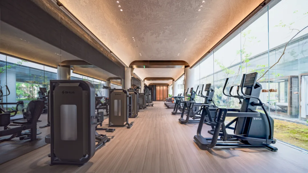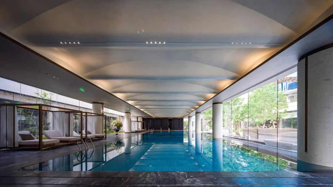 整座会所以庭院为魂、廊道为脉,将不同功能空间有机串联。听水书吧拥有整面落地窗,是静读之所,亦是中庭景致的最佳观景台;恒温泳池三面采光,畅游其间如置身天山湖泊;健身房与瑜伽区贯通相连,配备汗蒸房,构建完整的健康生活场景。