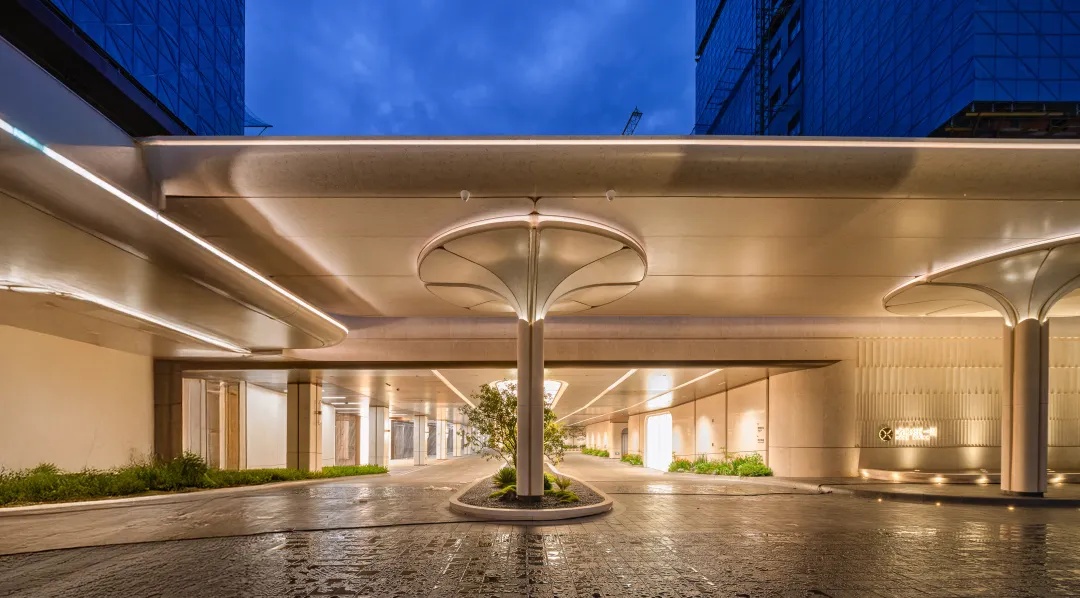 园区入口以贝金米黄石材为基底,点缀多处以银杏为造型的“玉柱华盖”景观柱廊,既营造出沉着儒雅的归家仪式,也借银杏“恒久传承、庇护守候”的美好寓意,为业主寄寓吉祥与守护。