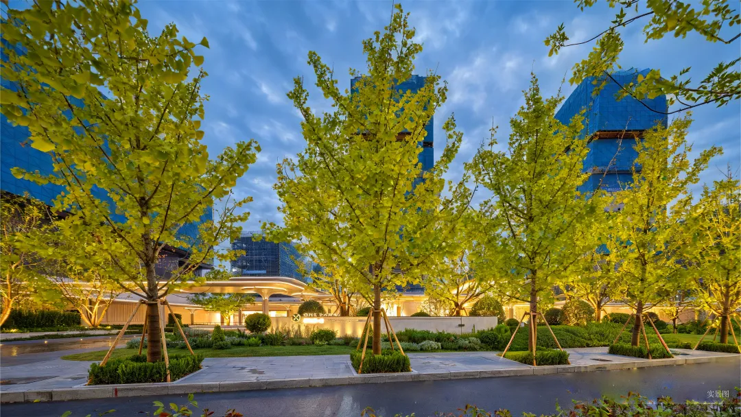 全区180棵银杏列阵迎宾,搭配油橄榄、丛生乌桕、铁冬青等十二重景观层次,构建出充满礼序与生命力的归家动线。