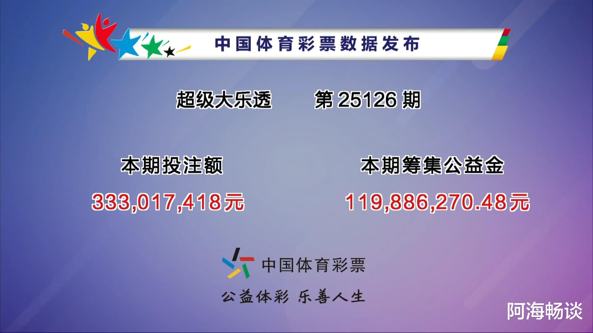 本期体彩大乐透第25126期,全国销售额为3.33亿元,所筹集公益金为1.20亿元。