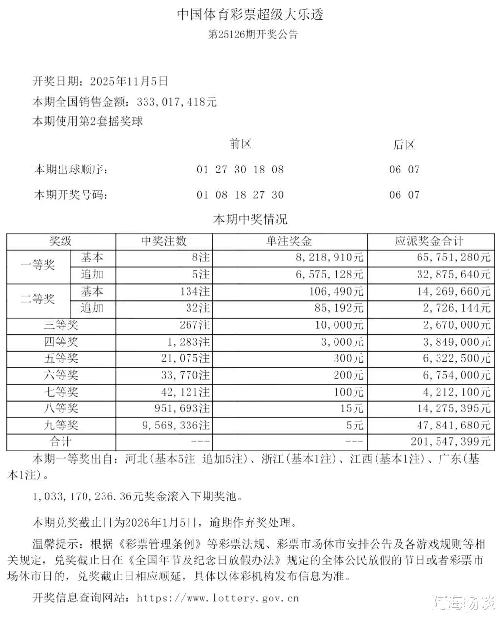 本期计奖后,有10.33亿元奖金将转入下期奖池。请务必注意,本期兑奖截止日期为2026年1月5日,过期则奖金作废。