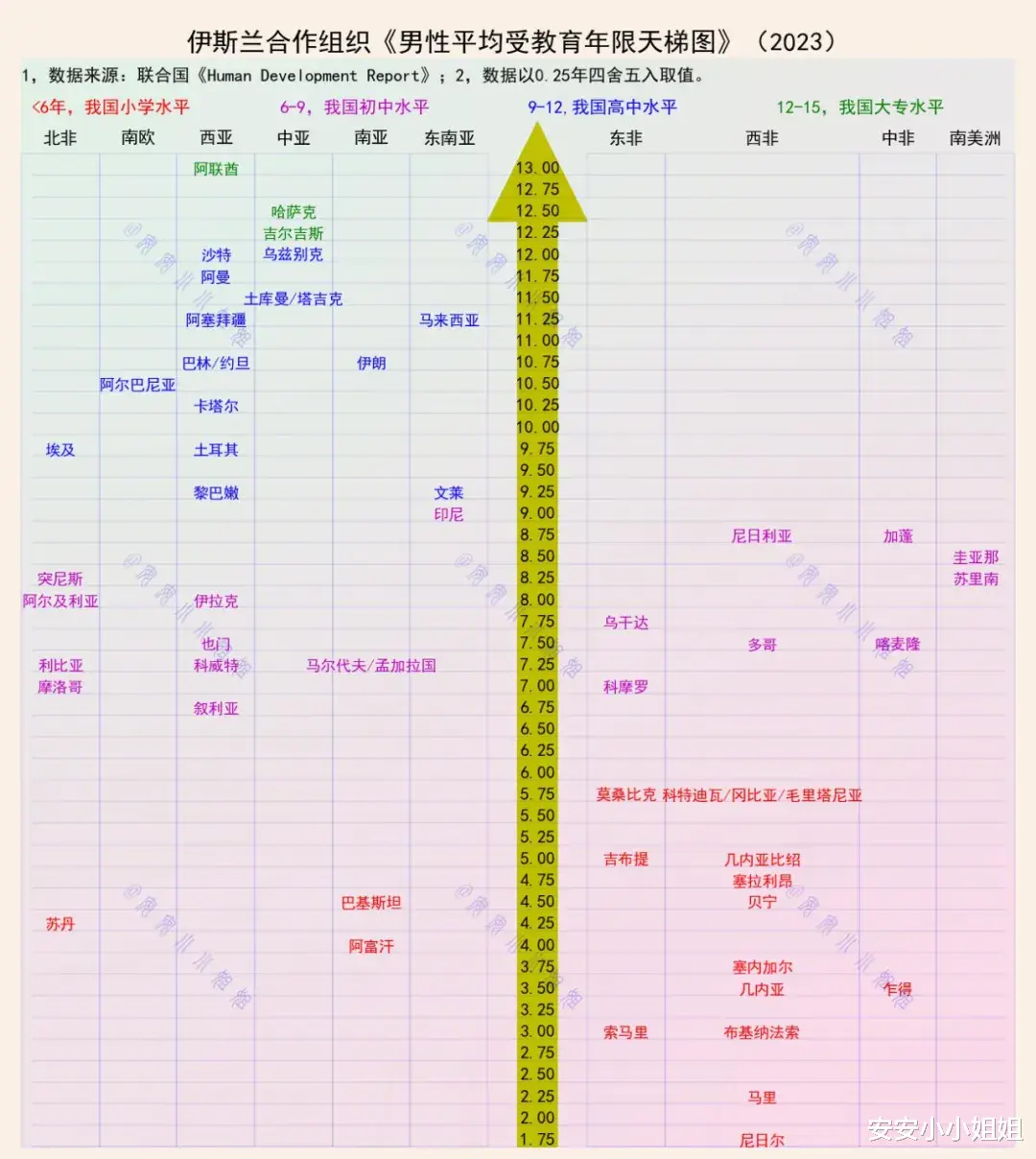 这一篇,我们取人类发展指数里的一个重要指标:人均受教育年限,观察伊斯兰各国25岁以上成年男性,人均接受了哪种水平的教育。关于受教育年限,此指标只说一个大于或等于25岁的人在学校接受教育的年数,并未说明幼儿园教育是否属于在前述的受教育年限统计范围。故在图表的分类里,我们不考虑幼儿园的情况,假定接受了6年教育的知识水平,与我国小学水平相当,超过12年假定与我国大专水平相当。如你所知,我国已经普及九年义务教育,但仍有大量的漏网之鱼(俗称九漏之鱼),这些漏网之鱼有一些共同的特征:区分不了事实和观点,缺乏必要的生活常识。伊斯兰各国的情况,跟这些九漏之鱼相比,情况会好多少?下述天梯图,展示了数据的分布情况。