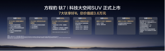 在购车权益上,方程豹更是诚意十足,为首批车主带来了总价值最高超3.6万元的7大钛享好礼!其中包括:覆盖多项座椅舒适配置的总价值10000元舒享升级包、价值3599元的BYD Pad套装、价值4500元的新车交付礼包均免费送;提供3年0息、5年低息、0首付起或至高84期等多重金融方案以供选择,金融贴息最高价值11300元;还有最高价值6000元的置换补贴、价值900元的智慧生态礼包,以及2年5G每个月的免费车机流量、非营运车辆长达6年或15万公里的整车包修、“三电”系统的终身保修、终身免费系统OTA升级等,让每一个家庭都能轻松拥抱钛7,让美好生活触手可及。