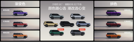 为了让广大用户选得尽兴,钛7直接一步到位,带来了7款外观颜色、3款内饰颜色,同步在官方商城上架了6款潮改方案,可满足不同用户的审美偏好。