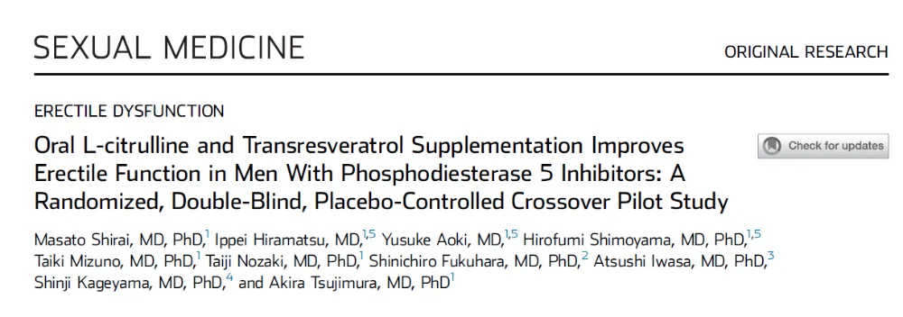 2、Shirai M, Hiramatsu I, Aoki Y, et al. Oral L-citrulline and transresveratrol supplementation improves erectile function in men with phosphodiesterase 5 inhibitors: a randomized, double-blind, placebo-controlled crossover pilot study[J]. Sexual medicine, 2018, 6(4): 291-296.