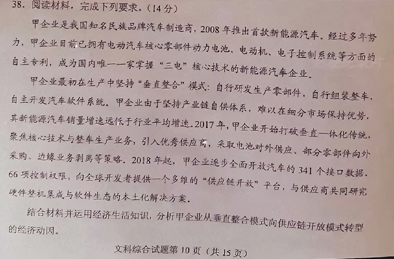 除了大学之外,中小学的一些试题中,比亚迪也有过亮相,比如21年高考乙卷文综题目就出现了以比亚迪为原型的“甲企业”,比如中学物理题中也会提到比亚迪具体的车,以及相关的技术。