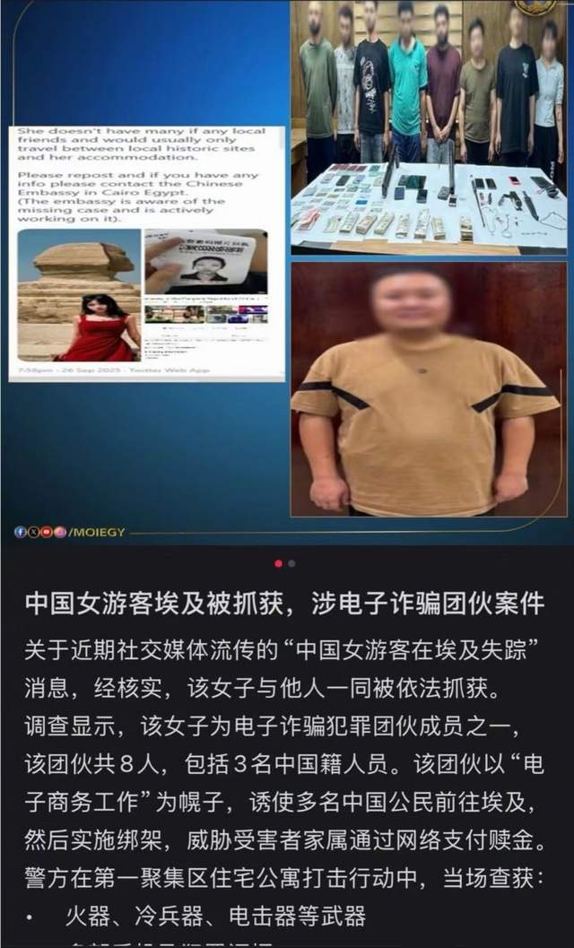 哎呀,这事儿,真是让人感觉“意料之外,情理之中”! 21岁的中国女孩,独自去埃及旅游,结果失联6天,最后发现是被抓了,而且是因为涉嫌参与电信诈骗! 这剧情,比电视剧还“跌宕起伏”。