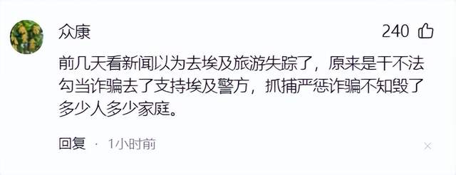 前几天看新闻以为去埃及旅游失踪了,原来是干不法勾当诈骗去了支持埃及警方,抓捕严惩诈骗不知毁了多少人多少家庭。