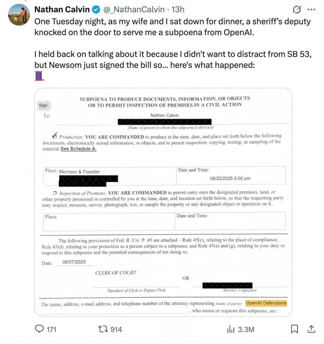 几个小时前,一位名为 Nathan Calvin 的 X 网友发推文称,「一个周二晚上,我和妻子正准备吃晚饭,一位副警长敲门,递给了我一张 OpenAI 的传票」。该传票不仅涉及他所在的 Encode 组织,还要求 Calvin 提供与加州立法者、大学生和前 OpenAI 员工的私人信息。而这一切都与一项近期通过的名为 SB 53 的法案有关。