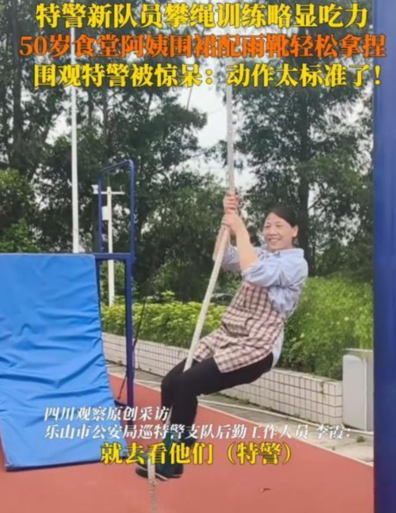 四川乐山特警队训练场近日上演“扫地僧”现世记。4月25日,当特警队员们如往常般进行攀绳训练时,一位身着胶皮雨靴、手拎菜篮的食堂阿姨,用堪比特种兵的身手,给这群精锐战士上了生动一课。