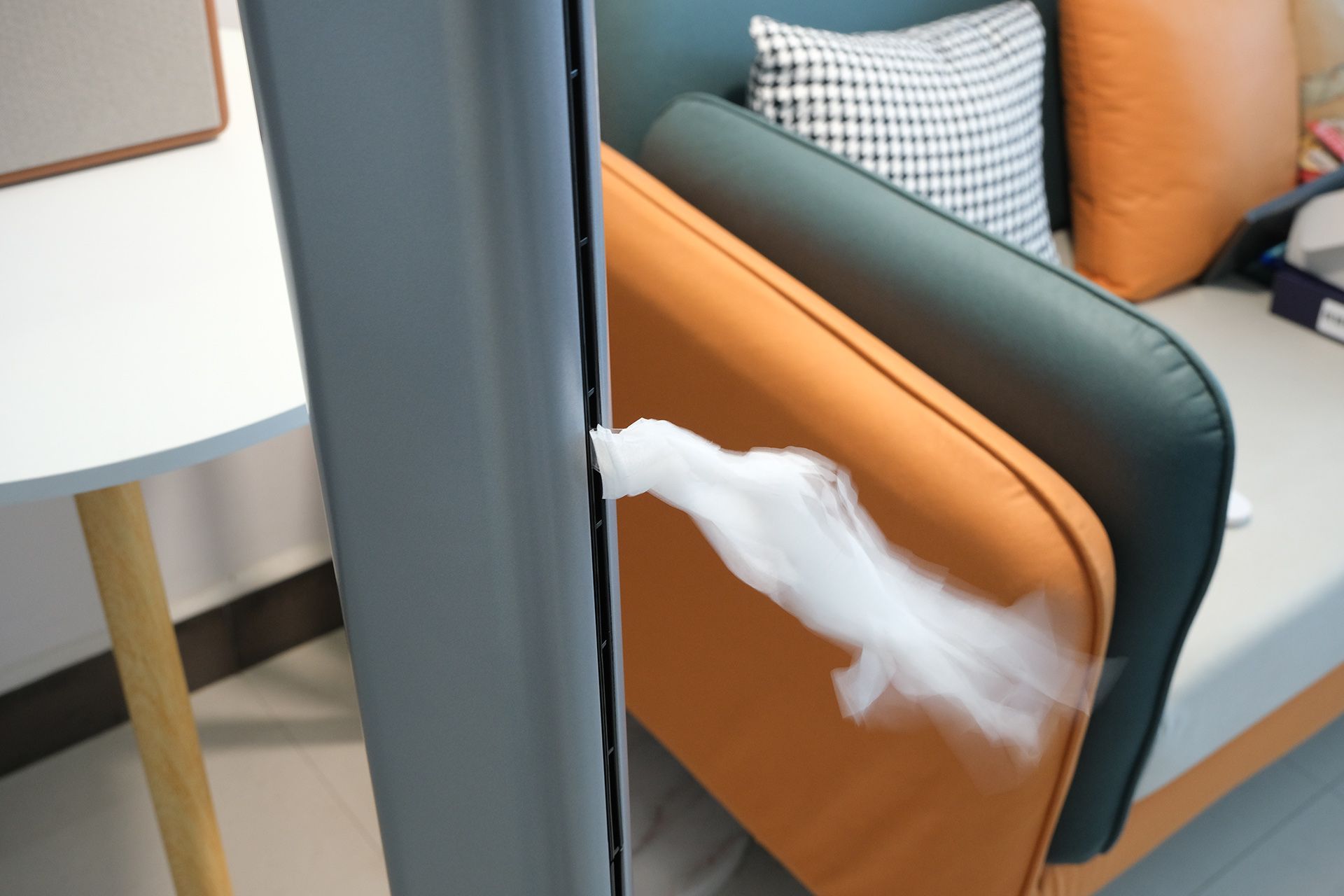 调3档时,纸巾的飘动没有明显下降,风速叶保持的很稳定。可以看到这款无叶风扇的优势在于,风速和风量稳定,相比传统风扇风吹到身体感觉更舒适。