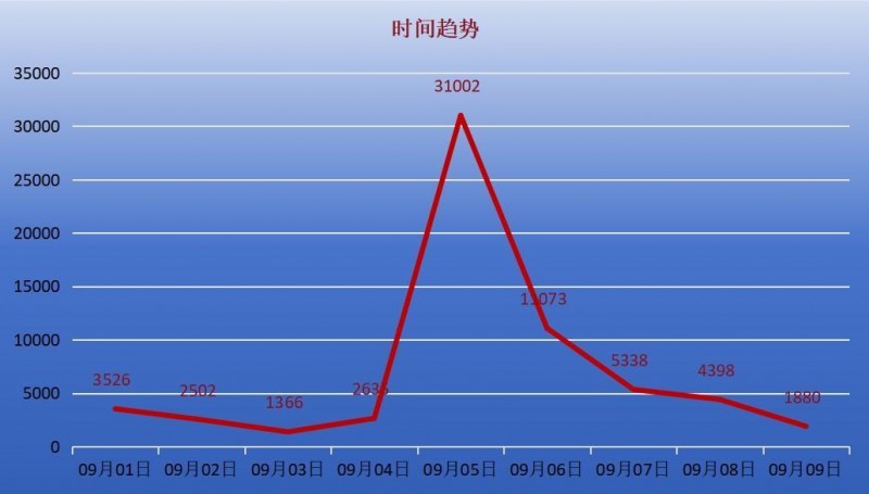 (以下为舆情系统监测核心数据,数据来源:哈谷识微,监测时段:2025/9/1 00:00–9/9 17:00)舆情总量约6.38万条,9月5日达传播峰值3.1万条。