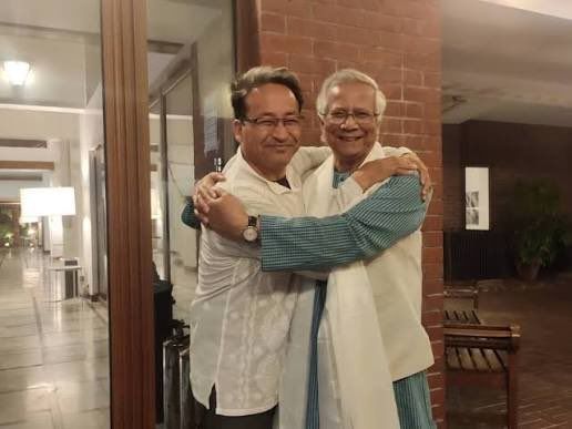 然后事件就更进一步发酵了,9月29日,旺楚克的妻子在社交平台上放出了一张照片。照片里,他和孟加拉国临时政府总理尤努斯站在一起。这张照片一出来,莫迪政府更加紧张。为什么?因为尤努斯就是通过孟拉加国“Z世代”运动上台的,那场运动,最终演变为政变,推翻了孟加拉国亲印政府。