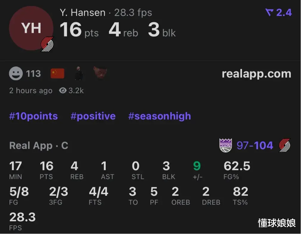 第三节的5分12秒到3分27秒,不到2分钟的时间里,杨瀚森4投4中,连着拿了10分,第三节单节杨瀚森一个人拿到了14分。