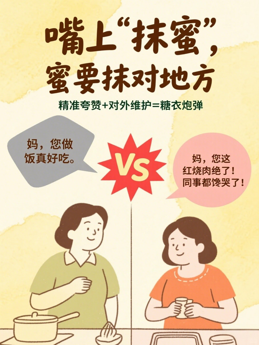 正确示范: “妈,您今天这红烧肉绝了!我同事都说,隔着屏幕都馋哭了,非让我跟您讨教秘方呢!”(具体+带上第三方羡慕,让赞美更真实)