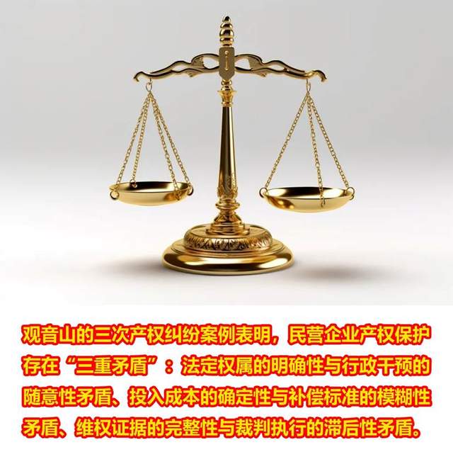 观音山的三次产权纠纷案例表明,民营企业产权保护存在“三重矛盾”:法定权属的明确性与行政干预的随意性矛盾、投入成本的确定性与补偿标准的模糊性矛盾、维权证据的完整性与裁判执行的滞后性矛盾。这要求产权保护必须从“形式确权”走向“实质保障”: