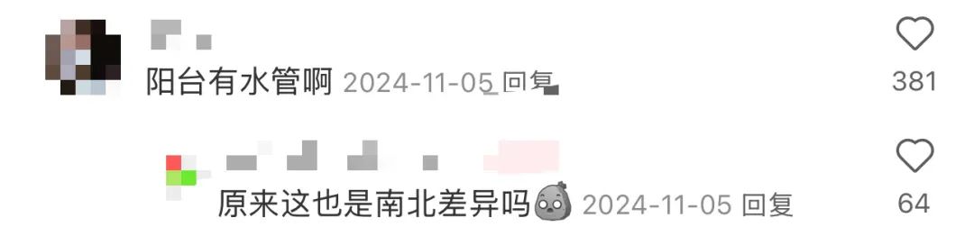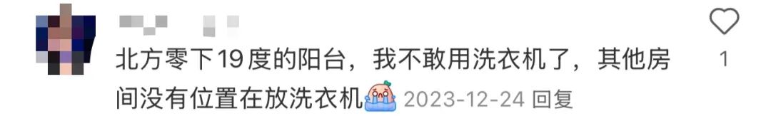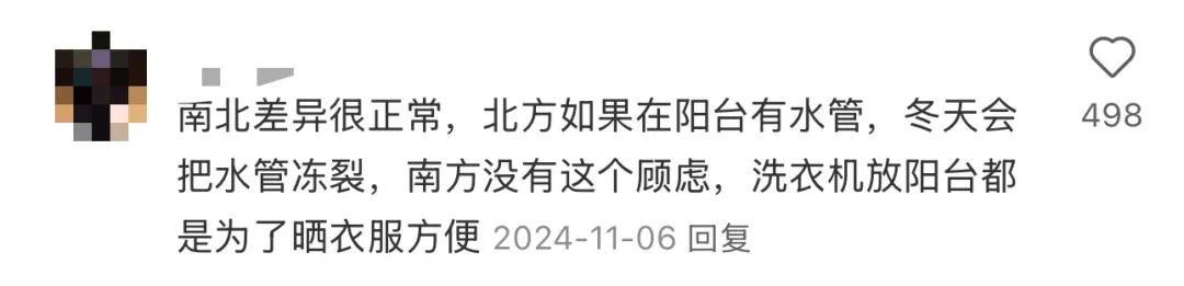 北方许多居民楼(尤其是老旧小区)的阳台根本没设计上下水,这也是出于北方冬季严寒的考虑。为了防止水管冻裂的麻烦,大多家庭的洗衣机都安装在更靠近“室内”的卫生间或者厨房。
