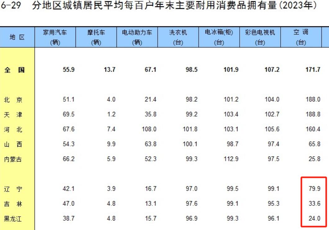 而辽吉黑三省平均每百户的空调拥有量分别为79.9台、33.6台、24.0台,同样远低于全国平均水平。