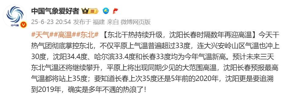 但今年6月下旬,东北地区出现了同期罕见的高温天气,多地气温冲上35度,28日,黑龙江多地气象监测站的气温甚至排到全国前十,霸榜全国前三。