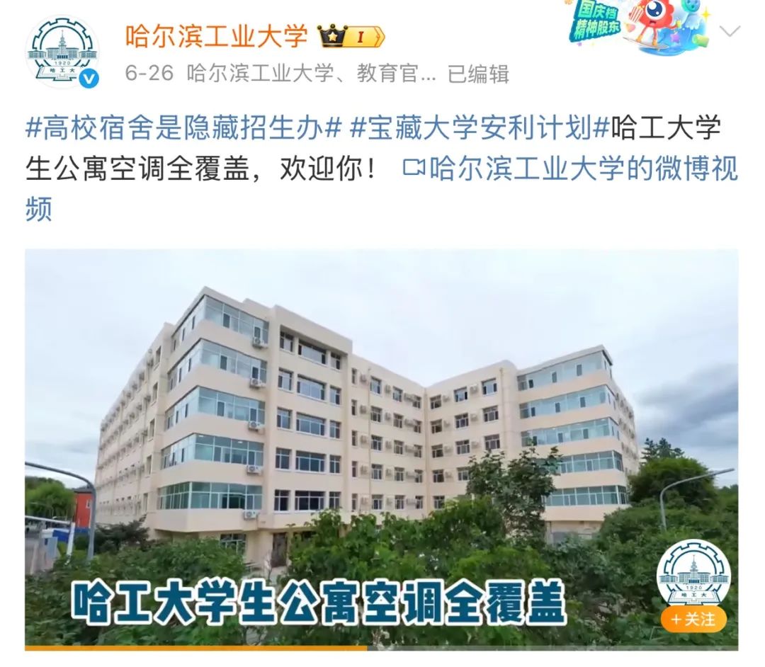 刚好赶上高校招生季,有空调的学校马上抓住宣传机会,哈工大为“学生公寓空调全覆盖”这么一件事儿专门剪了一条视频↓