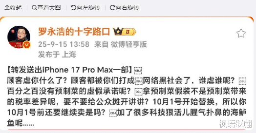 9 月 10 日,罗永浩在个人社交平台吐槽西贝;