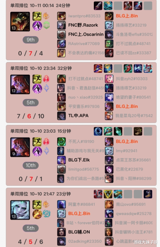 bin国服排位被路人打穿,0-7后被嘲讽,你是世界第一人机,近日,BLG上单选手Bin在峡谷之巅开启排位训练,却因为几场“翻车”表现意外登上热搜,凌晨时段的两场对局中,Bin状态明显不佳,甚至打出了“上单0-7” 的战绩。