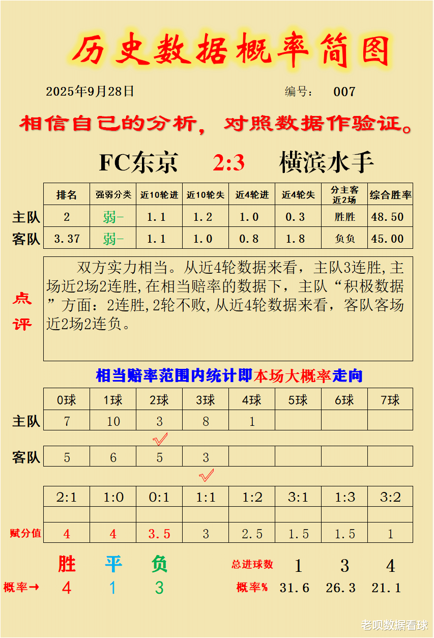 日职 主任编号:007 FC东京VS横滨水手 终场赛果为2:3,客队胜,总进球数5个,复盘历史数据大概率与当期赛果的验证情况如下,仅供球友复盘参考及下次跟踪,如觉得我们作品值得跟踪记得点关注。