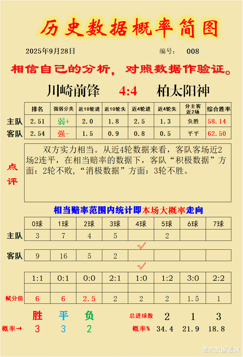 日职 主任编号:008 川崎前锋VS柏太阳神 终场赛果为4:4,双方握手言和,总进球数8个,复盘历史数据大概率与当期赛果的验证情况如下,仅供球友复盘参考及下次跟踪,如觉得我们作品值得跟踪记得点关注。