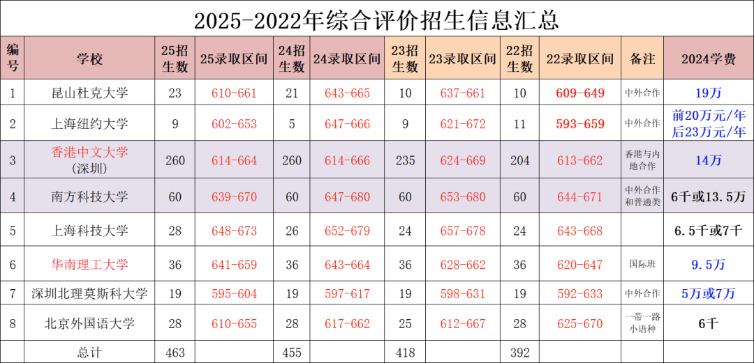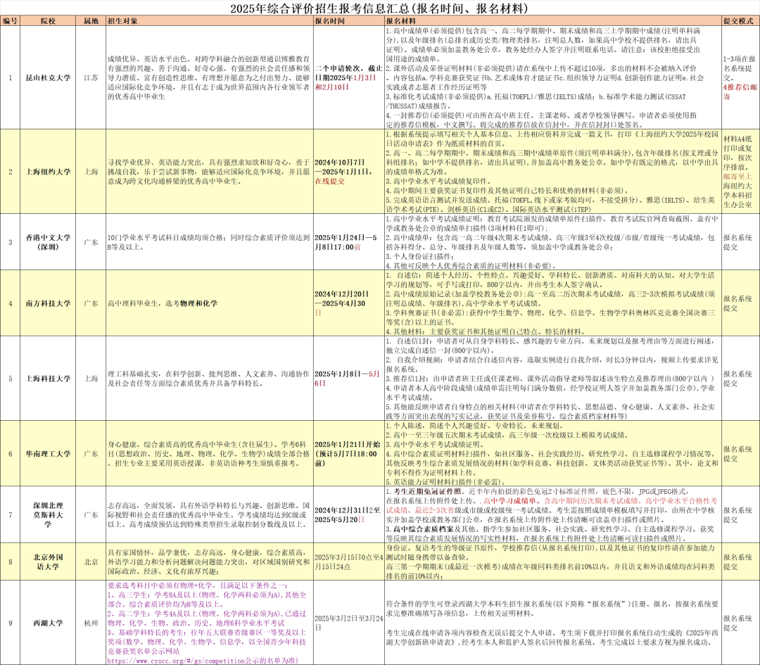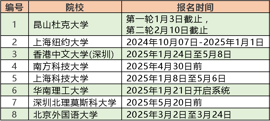 昆山杜克大学、上海纽约大学报名开始的较早,10月份左右开始报名,且在元旦前要完成报名,其他学校报名时间基本上在5月份结束。2025年8所高校综合评价报名时间参考如下: