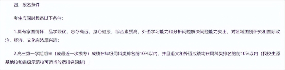 在报考具体条件上的表现一是高考成绩的要求,大多高校要求成绩达到本科线或特招线;另一方面就是重点高校对考生平时成绩的要求,如:北京外国语大学2025年一带一路外语专业综合评价招生简章中要求:高三第一学期期末(或最近一次模考)成绩在年级同科类排名前10%以内,并且语文和外语成绩均在同科类排名的前10%以内(我校生源基地校和省级示范校可适当放宽排名限制)。