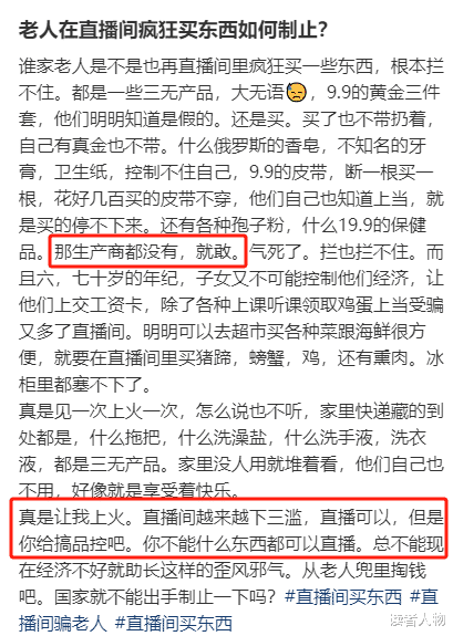 他们对网络世界的套路了解不多,又渴望通过网购来满足自己的需求,所以就成了不良商家和主播眼中的“肥肉”。