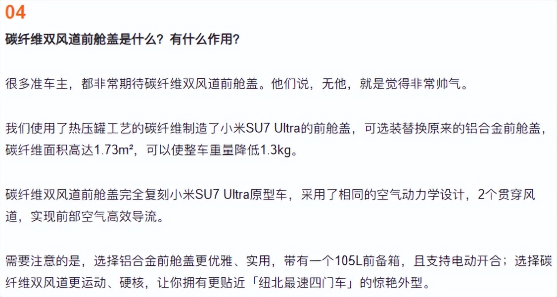 而本次引发车主维权的罪魁祸首是一个价值42000元的选配件。2月26日,小米汽车官方发布答网友问中提到,碳纤维双风道前舱盖完全复刻小米SU7 Ultra原型车,采用相同的空气动力学设计,拥有2个贯穿风道,能实现前部空气高效导流。