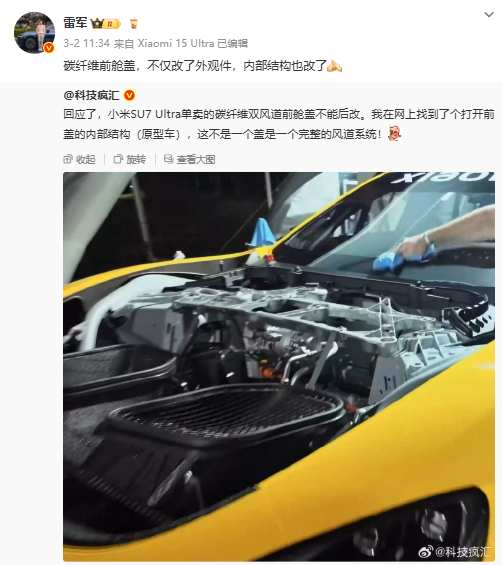 3月2日雷军通过微博转发了一张SU7 Ultra原型车的图片,并评论“碳纤维前舱盖,不仅改了外观件,内部结构也改了[作揖]”。