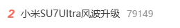 小米SU7 Ultra是小米汽车今年初推出的全新高端车型。根据小米汽车的官方数据,这款车最大马力1548PS,零百加速最快1.98s,最高时速350km/,标准配置就可以直接上赛道。受益于小米汽车强大的营销和品牌影响力,小米SU7 Ultra一经问世就吸引了众多小米粉丝的目光,开售两小时这款基础售价高达52.99万元的汽车订购量就突破了一万台。