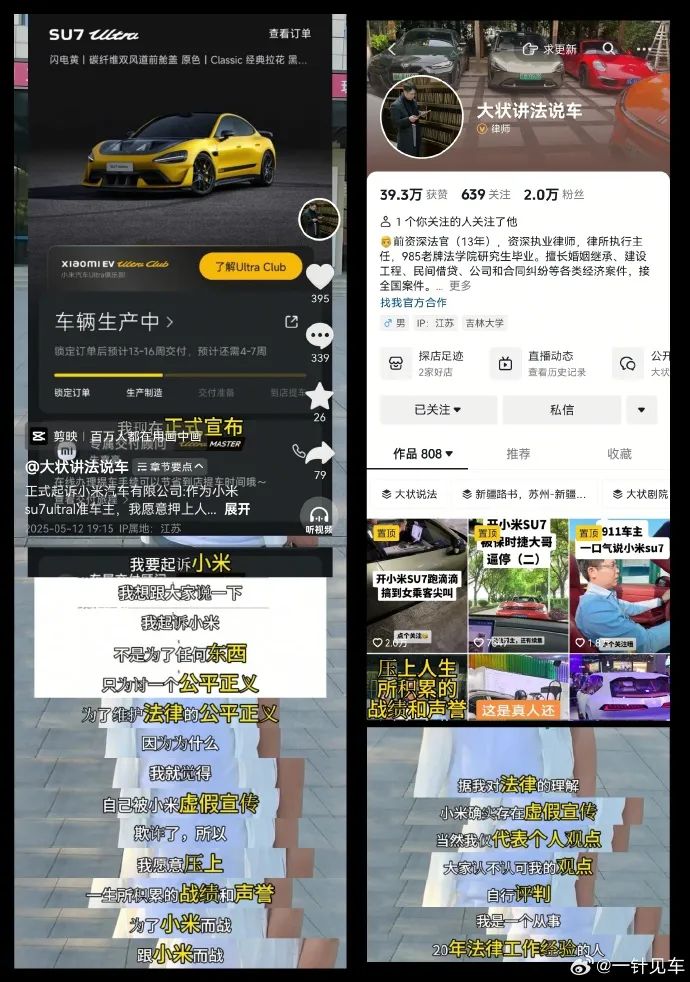 目前不少对小米汽车不满的SU7 Ultra车主已经发起了维权行动,一位从事法律相关职业的车主在社交媒体账号上公开表示要起诉小米。