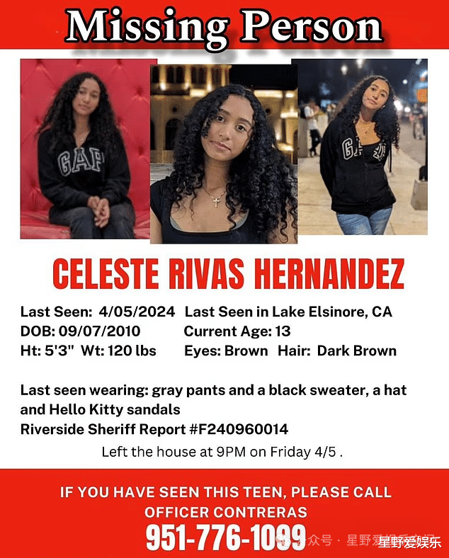 不过身份已经弄清楚了。死者是来自加州的15岁的少女塞莱斯特·里瓦斯(Celeste Rivas),曾多次离家出走,最近一次时间是在2024年5月的埃尔西诺湖附近,已经报失踪1年多了。失踪人口报道